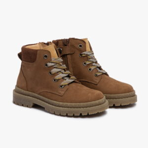 Questi stivaletti da bambino combinano resistenza, stile e comfort: la tomaia in suede marrone è completata da dettagli funzionali come i lacci bicolore grigio-giallo, occhielli metallici e zip laterale per una calzata pratica. Il collarino imbottito dona protezione e stabilità alla caviglia, mentre la suola chunky con battistrada profondo garantisce aderenza e sicurezza in ogni avventura outdoor.