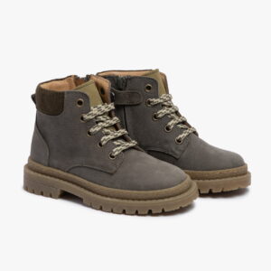 Questi stivaletti da bambino combinano robustezza, stile e praticità: la tomaia in pelle grigia con finitura testurizzata è completata da lacci beige passanti per occhielli metallici e da una zip laterale che rende la calzata semplice e autonoma. Il toppone imbottito assicura protezione e comfort alla caviglia, mentre la suola chunky con battistrada profondo garantisce grip e stabilità anche nelle giornate più dinamiche.