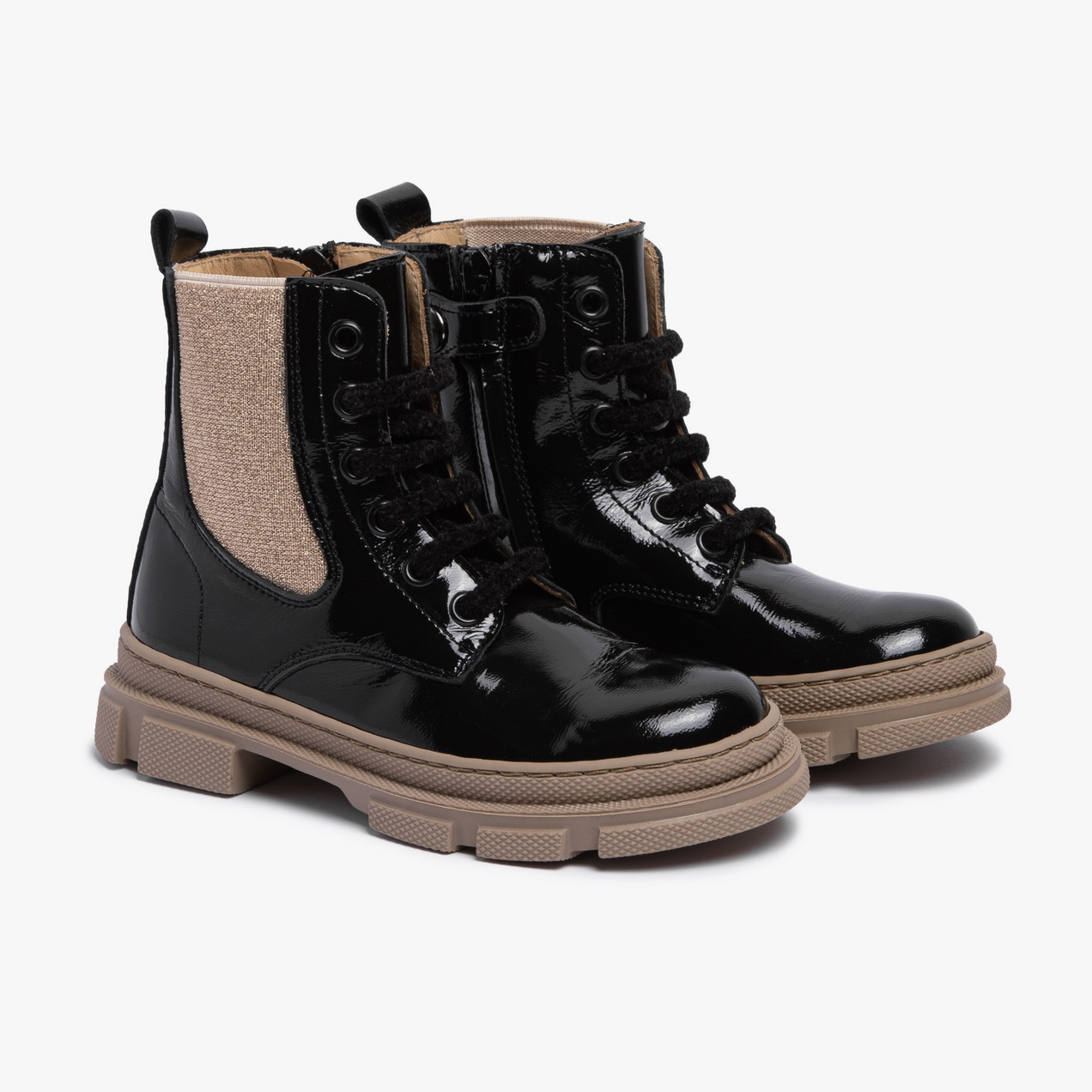 Questo stivaletto unisce il fascino della vernice nera lucida all’eleganza dell’elastico rosato laterale, creando un mix perfetto tra stile urbano e sofisticatezza. I lacci neri, gli occhielli metallici e la suola beige chunky con grip accentuato rendono la scarpa robusta, confortevole e assolutamente fashion.