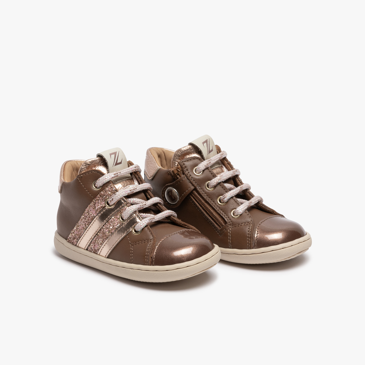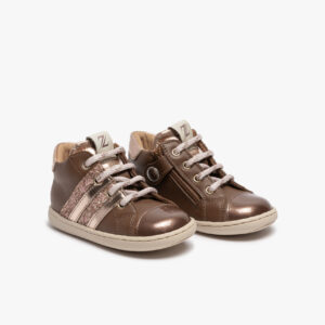 First step lace up sneakers with a side zip made with natural leather. The rubber sole is stitched to the shoe upper. The interior of the item has a natural calfskin lining and leather anatomical support. Available sizes from 18 to 29.