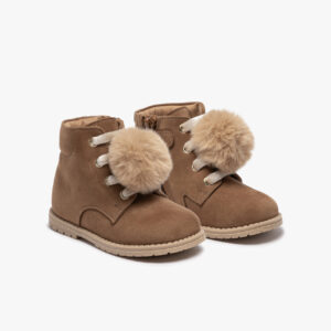 Lace-up ankle boot with a side zip, crafted from waterproof leather and adorned with a synthetic pom-pom. The rubber sole is mounted directly onto the last. The interior features a natural calfskin lining and an anatomically shaped insole. Available in sizes 18-29.