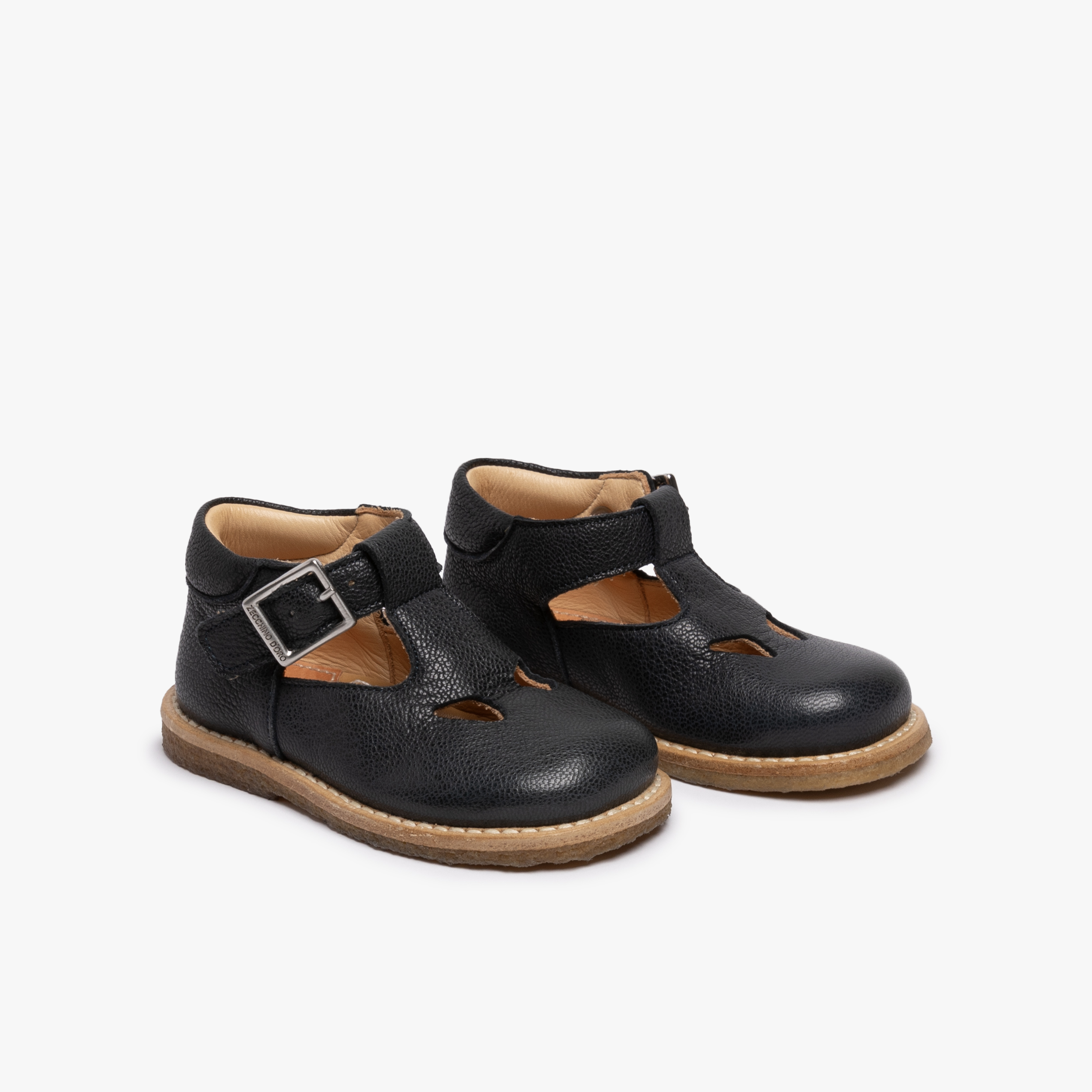 Shoes made with vegetable leather and 100% Metal Free. The para sole is mounted onto the form. The interior of the item has a natural calfskin lining and leather anatomical support. Available in antislip leather sole. Available sizes 18-26.