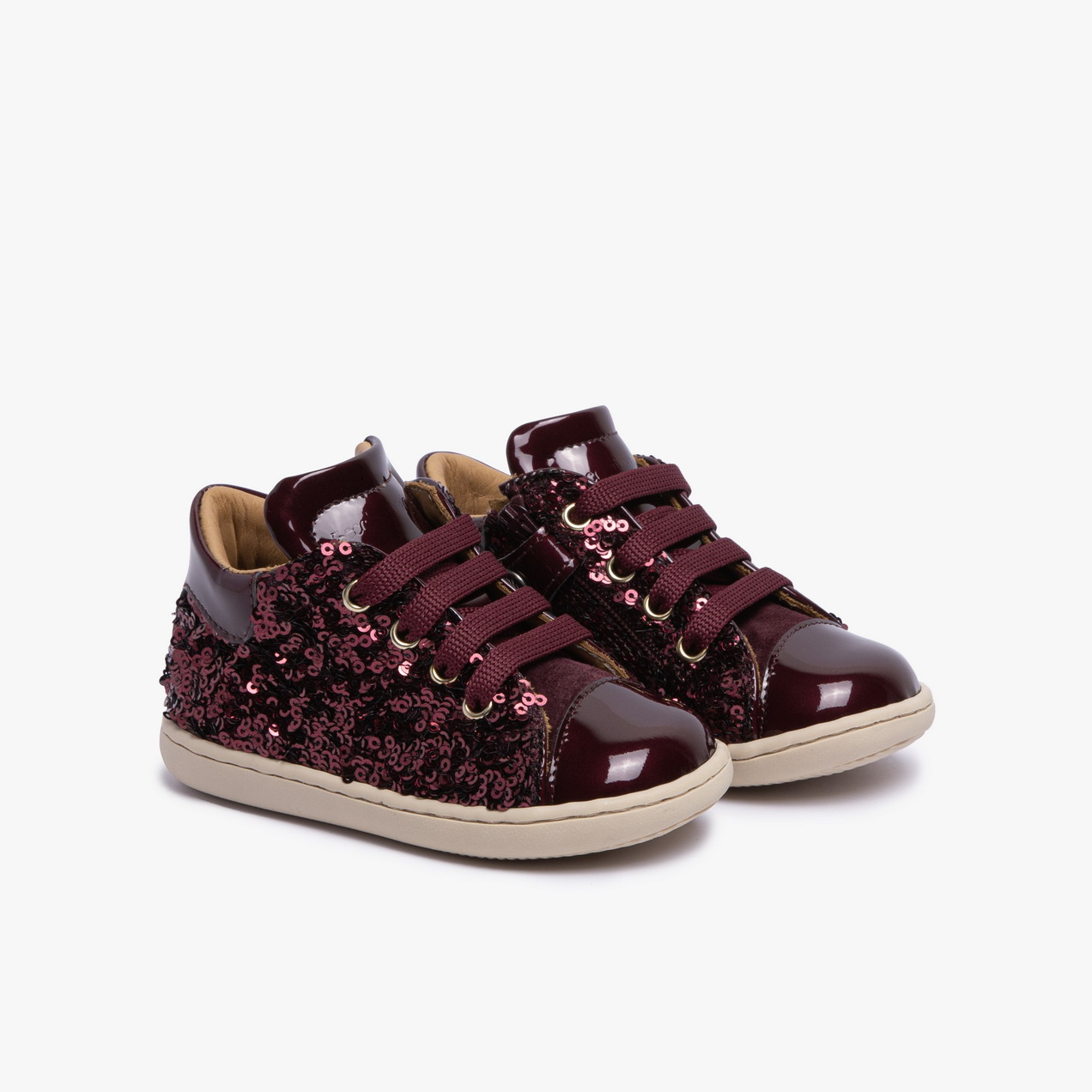 Un’esplosione di stile in formato mini: questa sneaker bordeaux con inserti in vernice lucida e paillettes laterali è pensata per chi ama brillare con personalità! La fodera in vitello naturale offre comfort e traspirabilità, mentre ila soletta in cuoio naturale con arco plantare assicura il giusto sostegno per un benessere quotidiano. Dettagli come i lacci tono su tono, gli occhielli dorati e la suola beige chunky completano un look deciso e pieno di energia.