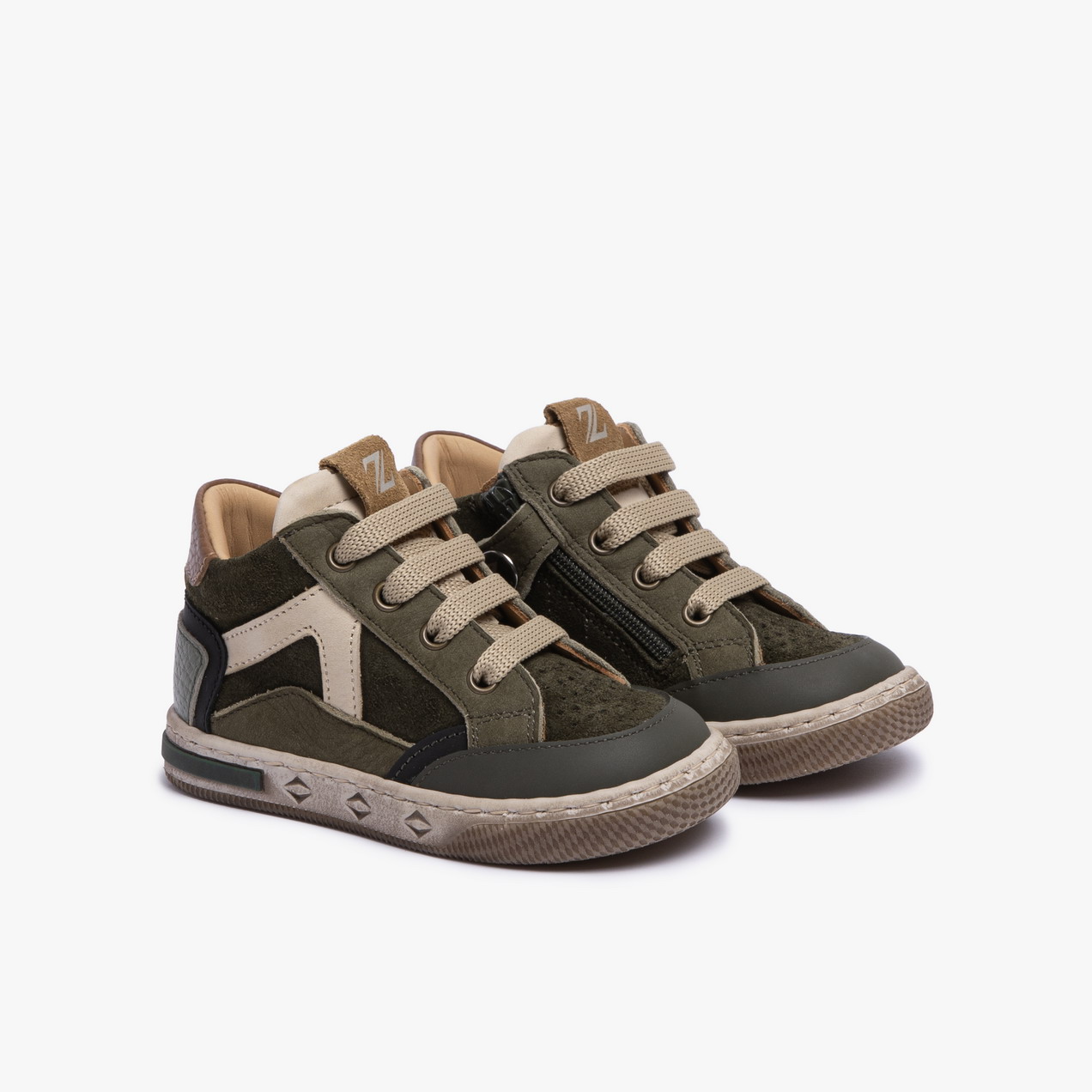 Una sneaker dal design dinamico nei toni verde oliva e beige, ideale per piccoli avventurieri. La fodera in vitello naturale assicura traspirabilità e morbidezza, mentre la soletta in cuoio con arco plantare in pelle offre il giusto sostegno per piedi in crescita.