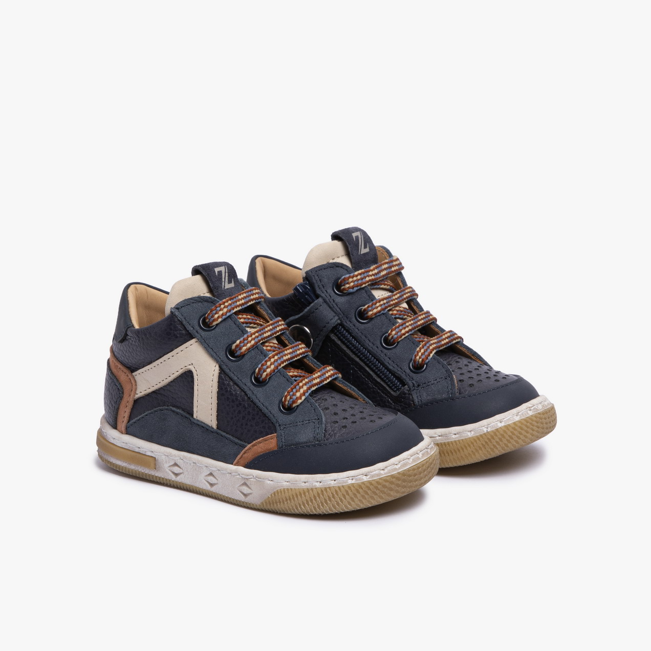 Una sneaker dai colori terra e dettagli vibranti, pensata per piccoli esploratori con stile. Il mix di pelle blu navy e inserti beige e marroni dona equilibrio e carattere, mentre la zip laterale rende la calzata pratica e veloce.