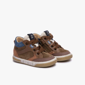 Un’ode al design quotidiano: questa sneaker marrone con tomaia in suede e pelle liscia si distingue per il suo stile discreto ma deciso. I pannelli laterali tono su tono e la texture vellutata la rendono sofisticata nella sua semplicità, pensata per piccoli esploratori dal gusto ricercato.