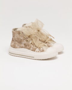 Romanticismo scintillante! La sneaker che sembra uscita da una fiaba moderna. La tomaia alta è ricoperta da paillettes dorate e beige, ma il vero protagonista è il maxi fiocco in organza che sostituisce i classici lacci, regalando un volume unico e sofisticato. Nonostante il look da principessa, la zip laterale e la suola robusta la rendono perfetta per la vita di tutti i giorni.