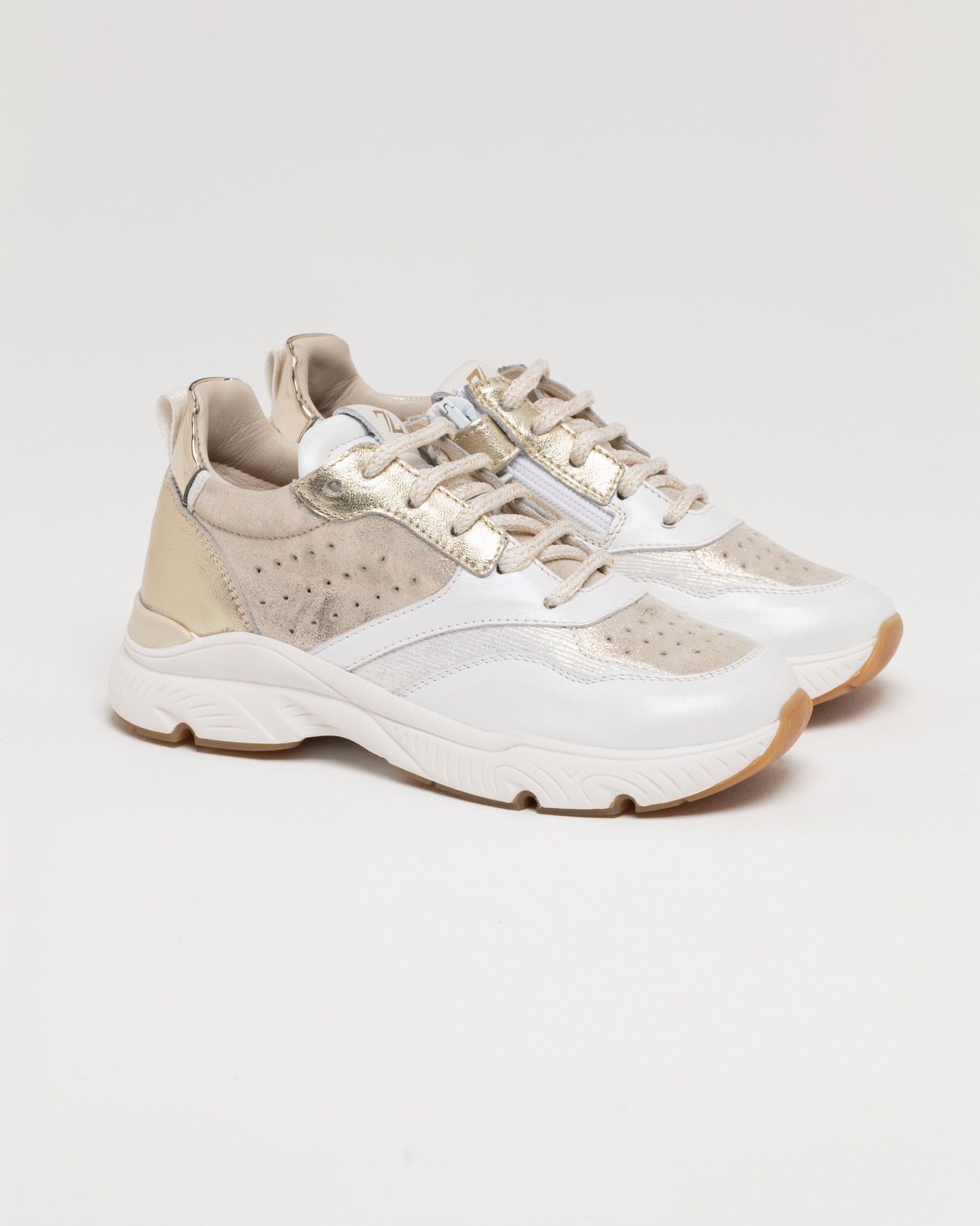 Luce ed eleganza dinamica! Questa sneaker low-top combina la pulizia del bianco con la preziosità dell’oro metallizzato. La tomaia multi-texture alterna pelle liscia, dettagli scamosciati e inserti laminati, creando un gioco di riflessi sofisticato. La suola chunky bianca offre ammortizzazione e uno stile contemporaneo, mentre la pratica zip laterale permette una calzata rapida senza rinunciare ai lacci.