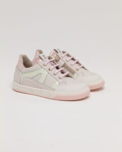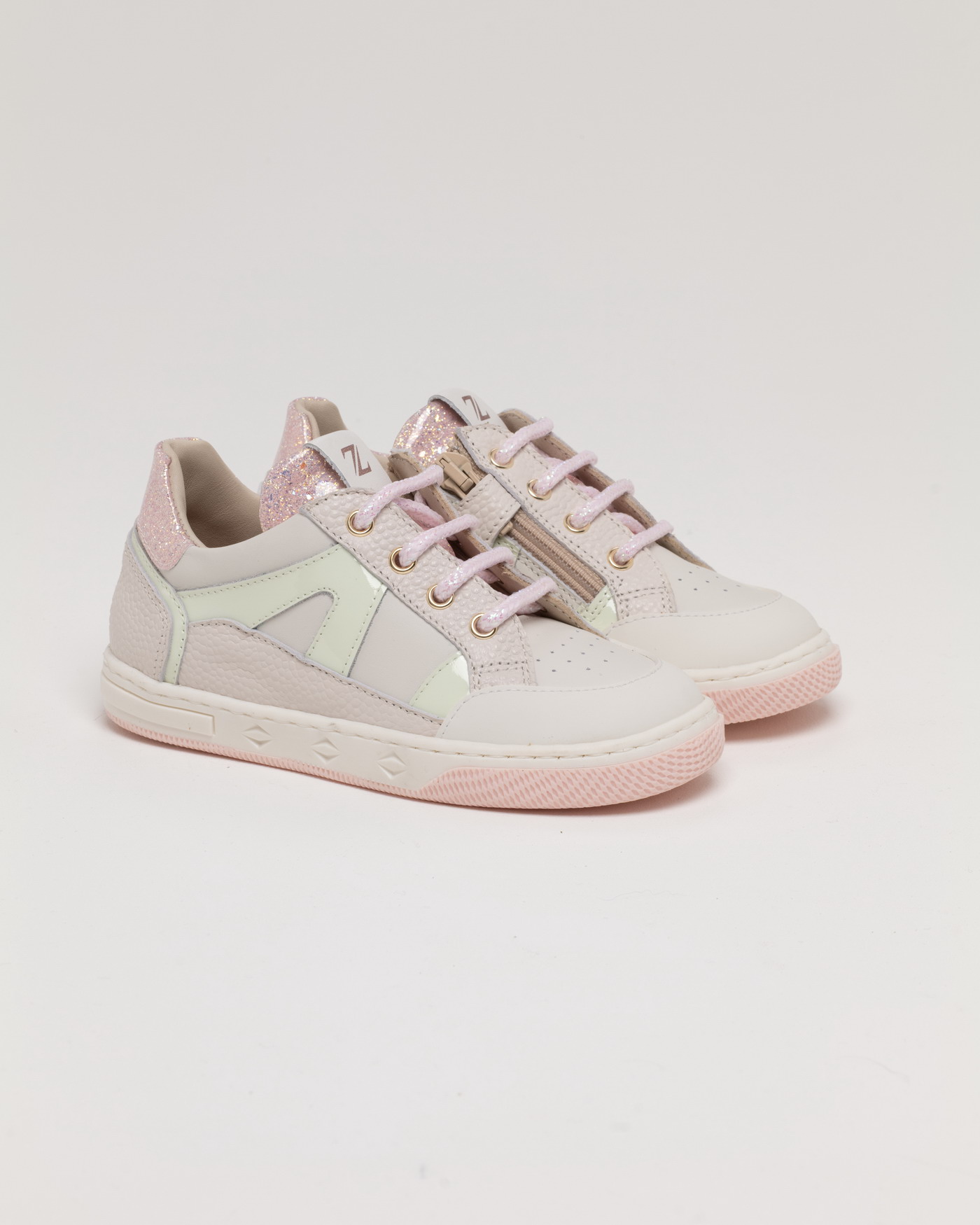 Dolcezza sportiva e dettagli glam! Una sneaker dal design moderno che gioca con una palette di colori delicati: base avorio arricchita da inserti geometrici in verde menta pastello. Il vero tocco di luce è dato dalla linguetta e dal tallone ricoperti di glitter rosa intenso, richiamati dai lacci coordinati. La suola testurizzata in rosa antico offre grip e uno stile unico, mentre la zip laterale garantisce una calzata rapida e sicura.