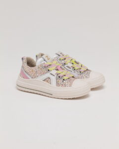 Energia Pop in ogni dettaglio! Una sneaker che non ha paura di osare: la tomaia in glitter multicolor è incorniciata da una struttura in pelle bianca con dettagli fucsia neon sul tallone. Il vero elemento distintivo sono i lacci a righe giallo fluo e rosa, che creano un contrasto vibrante e super contemporaneo. La zip laterale e la punta rinforzata la rendono tanto robusta quanto stilosa.