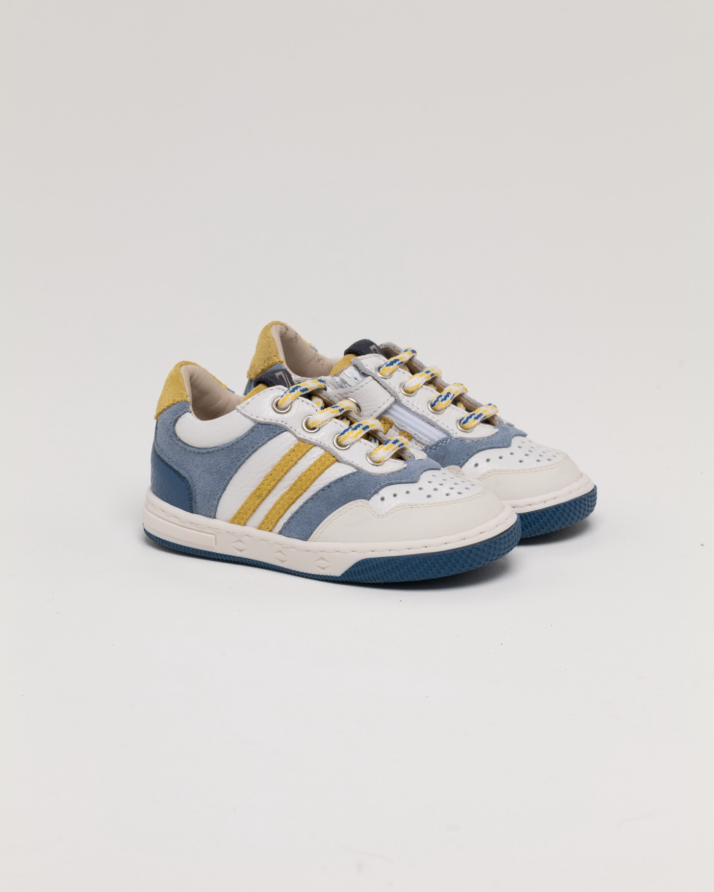 Un raggio di sole ai tuoi piedi! Questa sneaker celebra la gioia con le sue bande laterali giallo ocra che spiccano sui dettagli in suede blu denim. La suola “shell-toe” con piccole borchie a rilievo aggiunge un tocco moderno, mentre i lacci bicolore intrecciati richiamano lo stile outdoor. La pratica zip interna permette di calzarle in un attimo senza rinunciare alla tenuta dei lacci.