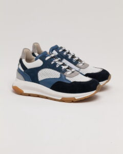 Il fascino del blu in chiave sportiva! Un gioco di sovrapposizioni tra mesh tecnico bianco e pregiato suede blu profondo. Questa sneaker stile “active” si distingue per gli inserti in pelle azzurro avio e i dettagli grigio fumo, creando una palette cromatica sofisticata e maschile. La suola chunky bicolore offre stabilità e un’estetica contemporanea ispirata alle passerelle.