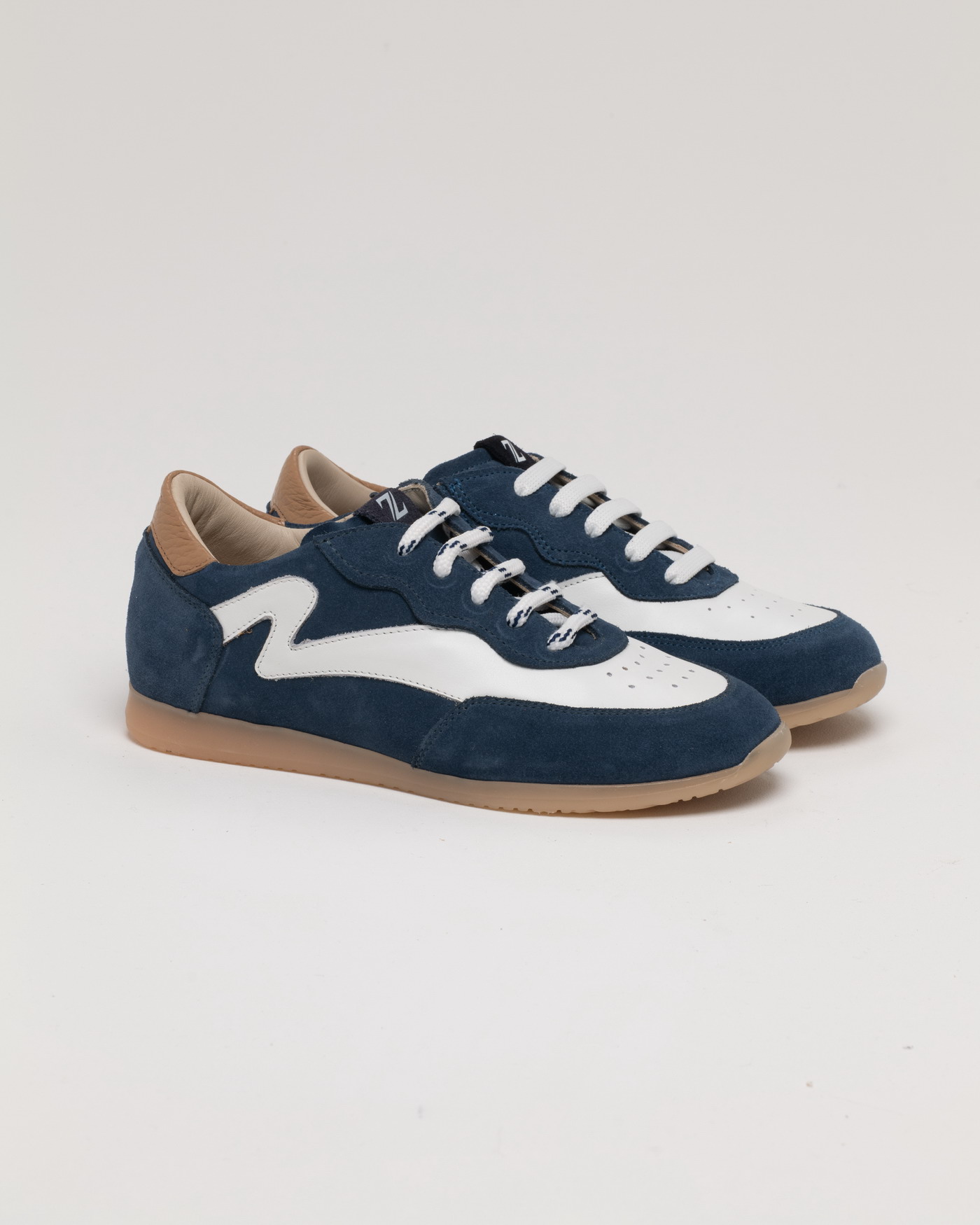 Stile iconico dal sapore vintage! Una sneaker dal profilo basso che gioca sul contrasto intramontabile tra il blu navy e il bianco ottico. L’inserto laterale a forma di saetta regala un carattere deciso e sportivo, mentre la suola color gomma naturale (gum sole) richiama il fascino delle calzature d’archivio. La fodera interna in pelle beige assicura una traspirabilità eccellente per tutto il giorno.